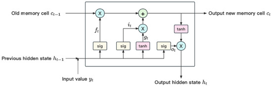 LSTM [31] is a specialized type of RNN designed to address the limitations of standard RNNs in handling long-term dependencies. LSTM controls the flow of information through its unique structural units, which include three key “gates”: the forget gate, input gate, and output gate. These gates allow the LSTM unit to retain or forget information as needed, enabling the network to flexibly remember or forget information. Figure 5 illustrates the specific workflow of LSTM.
