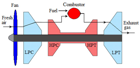 The main components of a BIGFAN include, in air flow direction, a fan, a low-pressure compressor (LPC), a high-pressure compressor (HPC), a combustor, a high-pressure turbine (HPT), and a low-pressure turbine (LPT) [46,47,48], as shown in Figure 4. The LPC is mounted on one shaft driven by the LPT, and the HPC is mounted on the high-pressure shaft driven by the HPT.