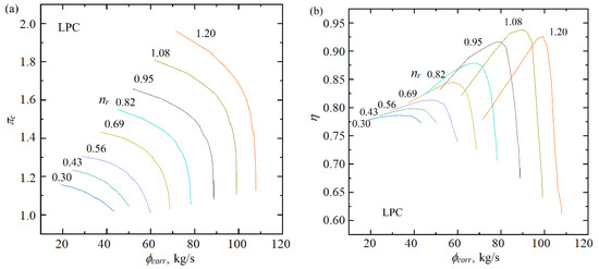 Performance map of the BIGFAN LPC [47]. (a) Performance map of mass flow rate. (b) Performance map of isentropic efficiency.