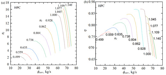 Performance map of the BIGFAN HPC [47]. (a) Performance map of mass flow rate. (b) Performance map of isentropic efficiency.