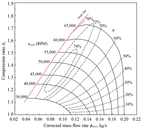 The performance map of an airliner ECS compressor is taken from [45], as shown in Figure 8. The data were read from the map using a computer software. The parameter ranges are the compression ratio πc from 1.02 to 1.73, the corrected mass flow rate ϕcorr from 0.04 to 0.2 kg/s, the isentropic efficiency η from 0.1 to 0.75, and the corrected rotational speed ncorr from 30,000 to 65,000 RPM.