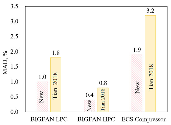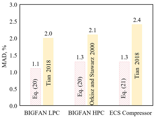 - The Tian [44] model has the highest prediction accuracy for the BIGFAN LPC and the ECS compressor, with MADs of 2.0% and 2.4%, respectively, while it predicts poorly for the BIGFAN HPC, with an MAD of 11.0%. The Orkisz and Stawarz [42] model has the highest prediction accuracy for the BIGFAN HPC, with MAD = 2.1%, and a moderate prediction accuracy for the BIGFAN LPC, with an MAD of 3.5%, while it predicts poorly for the ECS compressor, with an MAD of 15%.