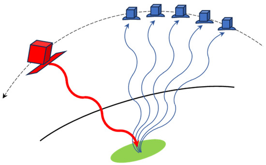 Although active SARs are under study for future along-track formation missions, a method to reduce the size and cost of SAR missions is the utilization of a passive-only radar designed to receive the signal transmitted by an active SAR (e.g., [26]). Such an approach can be extended by distributing the receiving-only radar over several smaller and simpler passive receivers. The parasitic signals are then combined by distributed aperture and beam forming processing techniques [27,28].