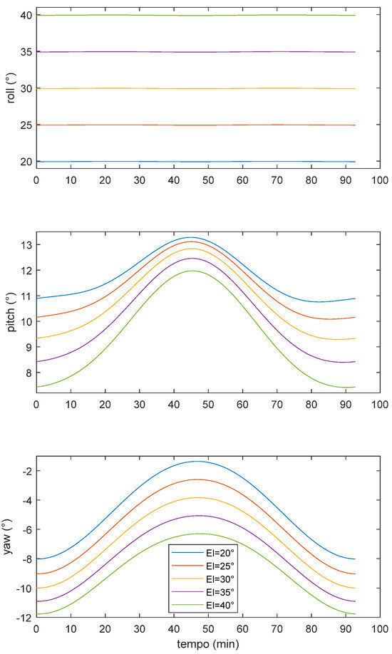 Figure 4 shows the trends of the roll, pitch, and yaw of Rx satellites. Required roll angles are almost constant and in practice coincide with the elevation angles of the transmitting radar. The required pitch angle is instead linked to the need to chase a radar that is further ahead and corresponds to an oscillation at an orbital frequency of a few degrees. The pitch angle mean value decreases with the Tx elevation angle, because the larger the Tx elevation, the closer the Tx beam center and Rx elevation direction are. The yaw angle instead increases with the elevation angle of the transmitting radar.