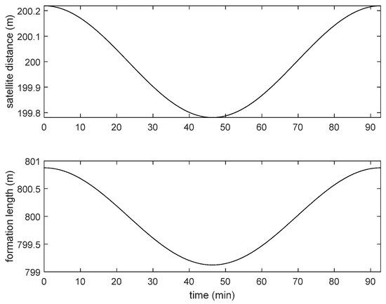 Rx elements are in close formation. As an example, consider a formation of five elements at 200 m distance for a total formation extension of 800 m in an along-track formation. To attain this along-track cluster, satellites are to be distributed over the same Tx orbit with a mean anomaly shift corresponding to the nominal satellite distance (1.7 × 10−3 deg). Since the orbit of the Tx is elliptical, one must expect an oscillation of this distance along the orbit. This oscillation will be of a small amplitude since the eccentricity of the transmitter is small. The separation between the successive satellites oscillates around the nominal value of 200 m with an amplitude of approximately 22 cm (Figure 5). The overall length of the formation also oscillates with an amplitude of approximately 88 cm around the nominal value of 800 m. In both cases, the amplitude of the oscillation is 0.1% of the nominal value; therefore, it does not pose safety problems for the satellites, at least in the nominal condition, since a drift in general will be observed due to secondary factors not yet included.