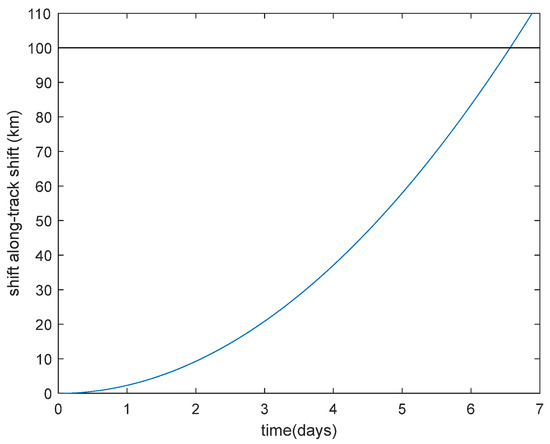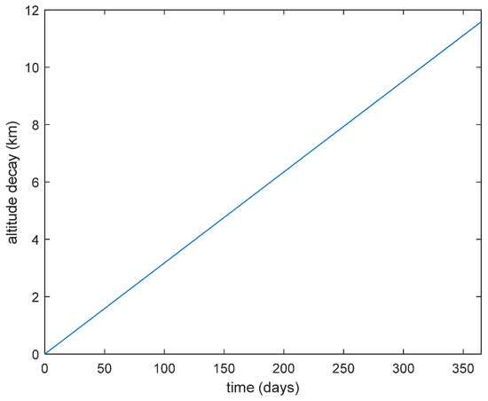 Remembering that the Tx satellite is considered on its nominal orbit because it is equipped with electrical propulsion, the effects of aerodynamic resistance (Equation (1)) lead to a relative orbital decay (Figure 8) estimated at about 11.6 km in one year if no orbital control is applied. The critical issue of orbital decay is related to the along-track drift, which is induced by an altitude difference (Equation (2)). Figure 9 shows that the Rx satellites, flying at a decreasing altitude, would proceed faster than the Tx satellite, and in less than one week, they would nullify the nominal 100 km along-track separation.