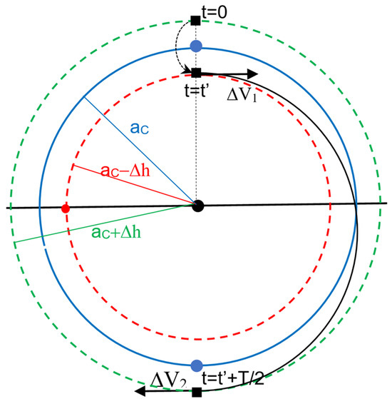 A maneuver strategy is proposed to compensate for the orbital decay due to the atmospheric drag without the need to correct for in-plane anomaly shifts. Let us refer to Figure 10, where the nominal, circular orbit of radius aC is highlighted in blue and the nominal satellite position is identified by the blue circle (clockwise orbital motion). Let us suppose that the satellite is initially placed on a circular orbit at an altitude higher than the nominal one (green circumference, semimajor axis aC + Δh) and at the same argument of latitude in order to have the nominal (blue circle) and the real (black square) satellites initially aligned along the local vertical.