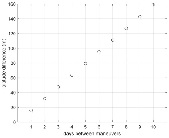 The model is applied to Rx satellites and PLATiNO-1, considering a different number of days between successive maneuvers, which has been varied between 1 and 10. Figure 11 shows the initial altitude difference necessary to perform the proposed maneuver. It varies linearly from a minimum of about 15.9 m to a maximum of about 159 m.