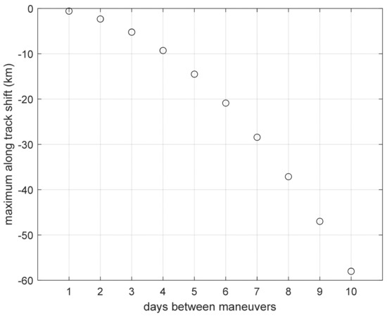 If about 6.6 days occur before applying orbital control, growth is allowed to become exponential (Figure 9) and its effects are demanding. Therefore, as a second example, the orbit maneuver is applied after 1 day (second column in Table 2) when the altitude has decayed less and, above all, the along-track drift is still following a linear pattern. The beneficial effects of reducing the time between maneuvers are clear. The reduction in ΔV per maneuver is so large that it overcompensates for the increase in the number of required maneuvers. The ΔV per year decreases by a factor of more than 6. Nevertheless, such a ΔV budget is still not compatible with the 12U Cubsat’s typical resources.