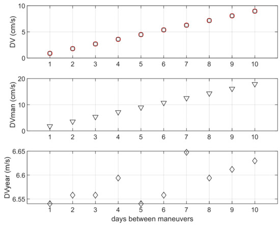 Finally, Figure 13 shows that the single velocity pulses are of the order of a few centimeters and are almost equal, which is expected because the lower and higher orbits are very close. Thus, each maneuver weighs less than 20 cm/s, varying from 1.79 cm/s to 17.9 cm/s. The annual budget for ΔV is around 6.6 m/s for any options, with oscillations related to integer truncation to determine the number of maneuvers per year.