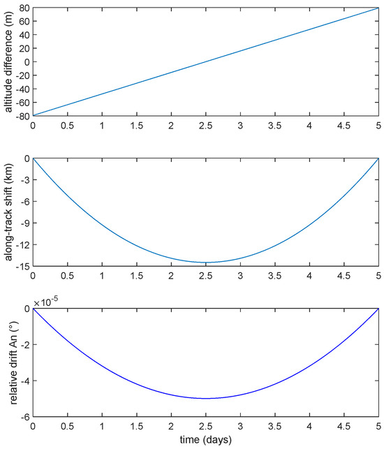 To highlight the maneuver’s peculiarities, a simulation has been carried out considering a non-linearized semimajor axis variation for the 5-day option (Figure 14). This requires an initial altitude difference of 79.4 m (upward), which reduces to zero after 2.5 days to increase to 79.4 (downward) at 5 days. The along-track drift varies from 0 (initial nominal condition) to a backward maximum of 14.5 km, attained at 2.5 days, to return to 0 at 5 days. Both these results are in full agreement with the linearized model, which confirms that the selected option meets the condition of the validity of the linearization.
