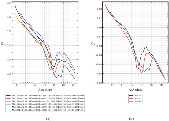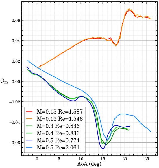 Figure 3. There we plot the pitching moment coefficient for different Mach number values. For ease of comparison, we keep the baseline configuration as well as similar Reynolds numbers across all polars. Besides, the sideslip angle can also be considered to be the same across all polars.