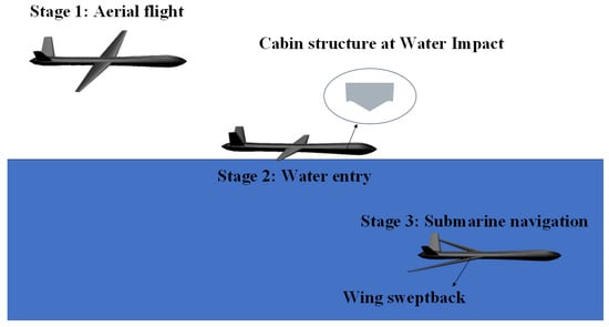 Different from conventional aircraft, the cabin structure of trans-domain morphing aircraft needs to carry the loads when it crosses the boundary of different domains. In this paper, the water entry process of the trans-domain morphing aircraft is shown in Figure 1. In the first stage, when the aircraft flies in the air, the wings unfold. In the second stage, when the aircraft enters the water, the bottom cabin structure collides with the water surface. In the third stage, when the aircraft sails underwater, the wings are swept back, which helps to reduce the drag caused by the water [8].