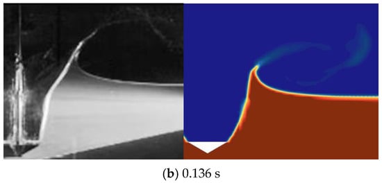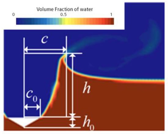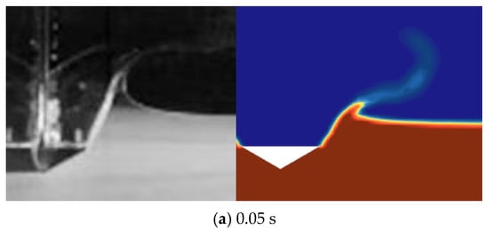 The upper surface of the wedge model is rectangular, measuring 0.3 m in length and 0.1 m in width. The wedge is inclined at an angle of 30° and has a mass of 4 kg. The pool used in the experiment measures 1 m in length, 0.35 m in width, and 1 m in height. Initially, the wedge is positioned 0.1 m away from the water surface. At the start of the experiment, the wedge is fixed, following which the high-speed camera and laser are activated. Subsequently, camera recording commenced and the electromagnet was deactivated, releasing the wedge. The high-speed camera is employed to capture phenomena of free-surface deformation and jet splashes. This paper simulates and analyzes the experiment using STAR-CCM+® [25]. Initially, the water surface is in contact with the wedge, and the wedge velocity is set to 1.4 m/s (). Since the experimental images are from a reference and only 2D images are available, we used 2D images from 3D simulations for comparison.