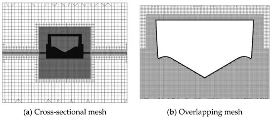 An overlapping mesh approach is employed to calculate the flow field during object motion. The overlapping mesh comprises a background mesh and sub-mesh that overlap. Although each mesh region spatially overlaps, they lack connectivity and exist independently. Connectivity needs to be established by preprocessing software after completing operations like digging holes and matching interpolation points. The benefits of overlapping meshes are primarily twofold. Firstly, it simplifies the meshing of complex geometries, allowing for the selection of the most suitable mesh for various calculation regions. Secondly, it facilitates mesh generation for parts in relative motion. Specifically, adjusting mesh positions for parametric studies is relatively straightforward. Figure 5 illustrates a schematic diagram of the mesh.