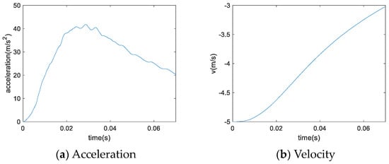 Figure 6 shows the change in acceleration and velocity of the rigid cabin structure, which has a mass of 700 kg and an initial velocity of 5 m/s. The acceleration increases rapidly once the structure enters the water and declines quickly after the peak value.