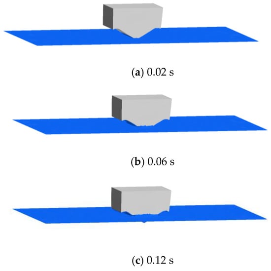 Figure 7 depicts 3D phase diagrams at various time points, illustrating the alterations in the shape of the free liquid surface as the entry depth increases. The parabolic bottom surface of the structure presented in this paper effectively suppresses the height of the jet if it is too high. Figure 8 showcases the phase diagram of the gas–liquid interface, providing a visual representation of the rational and effective design of this structure.