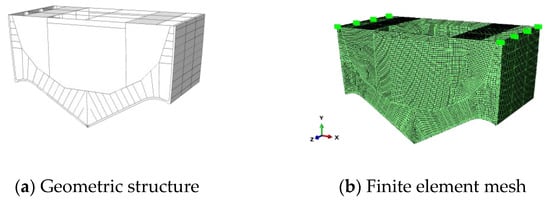 The CFD model setup remains consistent with that outlined in Section 3.1. Abaqus is employed for finite element modeling of the cabin structure. Utilizing beam and shell elements for finite element analysis to mimic specific structural types can enhance computational efficiency. The cabin structure model contains numerous reinforcing structures, which are simplified using beam elements. This simplification ensures calculation accuracy while better representing the force characteristics of the actual structure. Components like skins and internal ribs, significantly thinner compared to other dimensions, are modeled with shell elements.