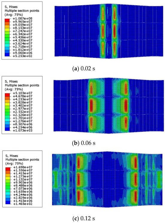 Figure 12 illustrates the stress diagram at various time points; the unit is Pascal (Pa). The location of maximum stress consistently shifts to both sides as the depth of water entry increases. Stresses within the submerged section of the structure steadily diminish with escalating depth of water entry.