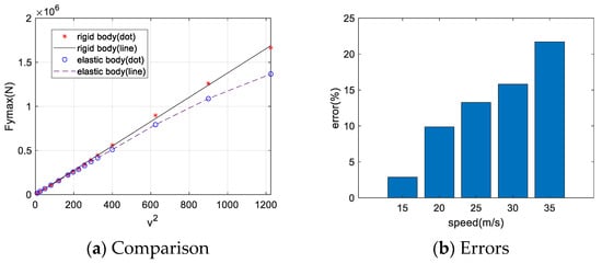 Figure 13a compares the peak vertical impact loads at different velocities between the elastic and rigid cabin structure water entry analyses. Figure 13b illustrates the error between the elastic and rigid cabin structure under different velocities. With increasing water entry velocity, the error between elastic and rigid cabin structure water entry analyses grows.