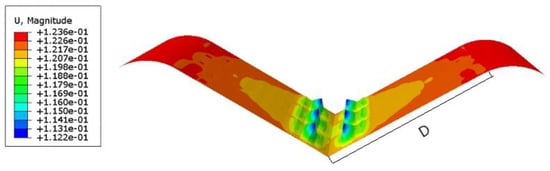 where is the maximum deformation of the structure during water entry of the cabin structure and D is the length of the bottom wedge of the cabin structure (1.27 m in the current study). To better illustrate the deformation trend, Figure 14 displays the maximum skin deformation magnified by a factor of 10.
