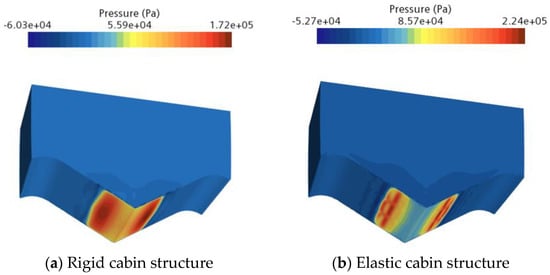Rigid (a) and elastic (b) cabin structure water entry surface pressure diagrams.