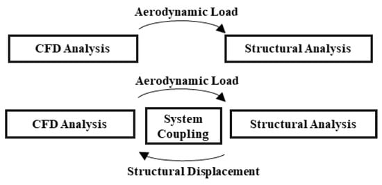One-way (for rigid wing) and two-way (for elastic wing) solution process.