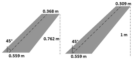 The baseline model used in this study is the AGARD 445.6 wing [39], which is a well-known test case for aeroelastic problems. It is a swept wing with an NACA 65A004 airfoil [39]. In the current study, the span of the baseline AGARD 445.6 wing is increased by about 30%, which leads to a decrease in the stiffness of the wing, making the static aeroelastic effects more remarkable. The dimensions of the baseline and the elongated AGARD 445.6 wing and the first four natural frequencies are given in Figure 2 and Table 1, respectively.