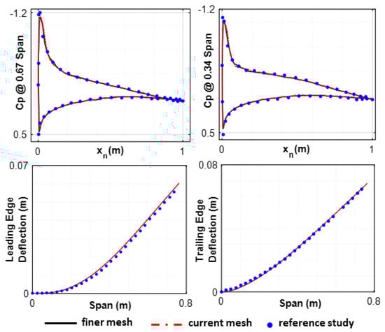 It is noted that the differences between the current and the finer meshes in terms of 3D CL and maximum wing deflection results are insignificant. In addition, the Cp distribution and the edgewise deflections obtained from the static aeroelastic analysis of the baseline AGARD 445.6 wing are compared with the reference study [40] for different mesh densities in Figure 3.
