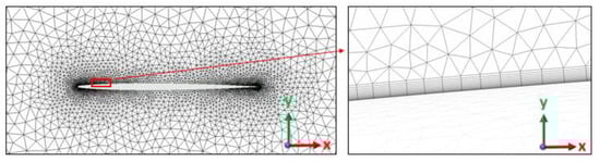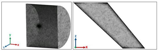 The comparative study presented in Figure 3 shows that the mesh case represented as the ‘current mesh’ is able to predict the results obtained by Cai et al. [40] accurately. Therefore, the ‘current mesh’ is also adapted for the elongated AGARD 445.6 wing. In the CFD model of the elongated AGARD 445.6 wing, the fluid domain is made from a half cylindrical prism cut by the symmetry plane, and the wing is placed inside the half cylindrical prism, as shown in Figure 4.