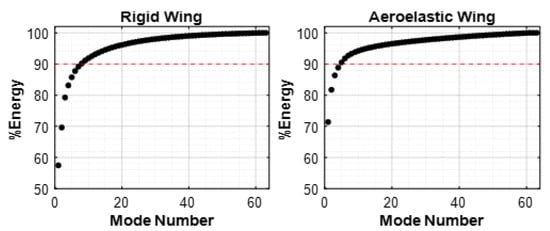 A reduced order model is constructed both for the rigid and aeroelastic wing configurations using POD. By applying the MOS technique, the energy of the system captured by each mode and the corresponding basis functions are obtained. It should be noted that since the number of nodes on the surface of the 3D wing is far more than the number of variables, MOS is computationally much faster; therefore, in the current study the MOS technique is used. For the rigid wing, 1 mode captures 57.48% of the energy, while for the aeroelastic wing the percentage increases to 71.38%. The results show that in order to reach at least 90% of the energy of the system, 8 modes are required for the rigid wing and 5 modes are required for the elastic wing. The accumulated energies for Cp distributions with respect to mode number are given in Figure 6.