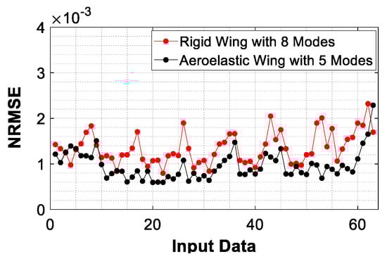 NRMSE for reconstructed flow conditions for the rigid wing with 8 modes and the aeroelastic wing with 5 modes.