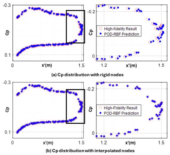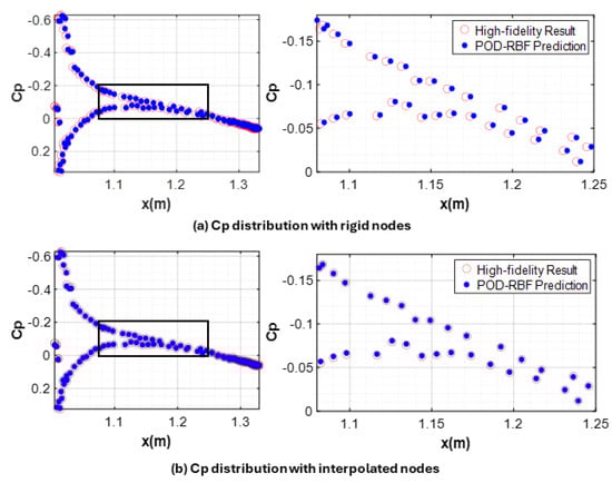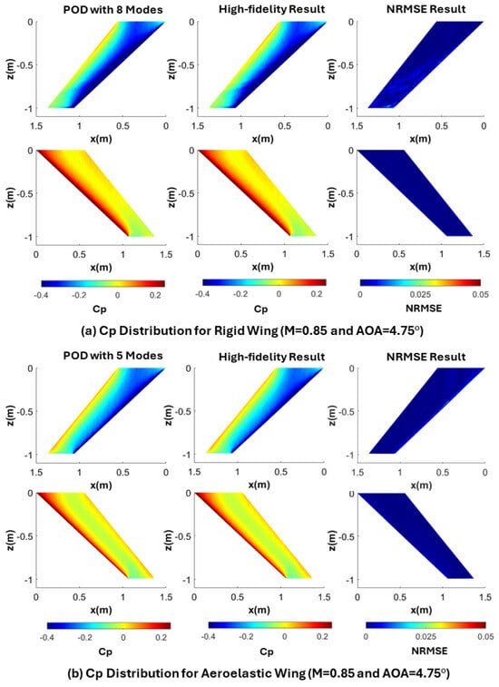 As is clearly seen in Figure 7, NRMSE values of the reconstructed results, with 8 modes for the rigid wing and 5 modes for the aeroelastic wing, are very close to zero, which proves the accuracy of the results. It should also be noted that NRMSE results are lower for the aeroelastic wing for the majority of the flow cases. To verify that 8 and 5 modes are sufficient to reflect the actual results for the rigid and aeroelastic wings, respectively, Cp distributions of the least accurate flow condition are compared with the high-fidelity Cp in Figure 8.
