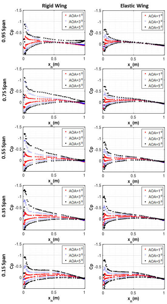 Figure 10 shows that for the rigid wing, at a higher AOA such as 5°, the Cp distribution ceases to follow a pattern like the aeroelastic wing. Figure 12 displays the streamlines around the rigid and the aeroelastic wings for the 5° AOA case at the five different sections of the wing shown in Figure 11.