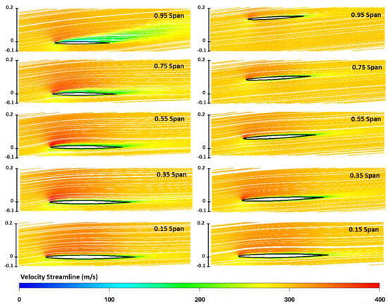 As seen in Figure 12, for the rigid wing, at 5° AOA flow starts to separate, whereas it is still attached for the aeroelastic sweptback wing. The separation progressively increases from wing root to the wing tip. It is worth noting that the wing concerned has a relatively thin airfoil which gets thinner towards the tip, making it more prone to separation. The streamlines exhibit a pronounced upward deflection near the leading edge. However, for the aeroelastic sweptback wing streamlines are relatively undisturbed and follow the airfoil smoothly without a pronounced separation. The reason for this behavior is attributed to the decrease in the effective AOA due to the inward twist of the aeroelastic sweptback wing due to bending. The decrease in the effective AOA at different sections of the aeroelastic wing (Figure 11) at the same flow condition (M = 0.85 and AOA = 5°) is shown in Figure 13.