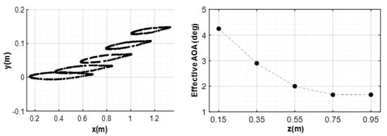 Twist of the aeroelastic wing at different sections (left), and decrease in the effective AOA at these sections (right).