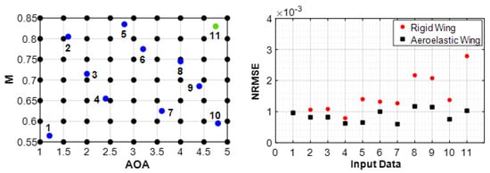 In this section, the POD-based reduced order models are coupled with the RBF interpolation method to predict the results at intermediate variables that do not exist in the original data ensemble. For this purpose, Latin hypercube sampling (LHS) is adopted to decide on 10 flow conditions in the selected interval. The LHS method divides the interval into subintervals and guarantees that each of them has a single sample. Therefore, LHS is able to provide better uniformity compared to random sampling, even if the samples are selected randomly. In Figure 14, parameter pairs used for the assessment of the POD-RBF model as well as the NRMSE results for each case are shown. Parameter pairs shown as black dots are the data samples from the snapshot matrix, whereas the 10 parameter pairs derived from the LHS are shown as blue dots. Moreover, an intermediate flow condition at high M and AOA (M = 0.83 and AOA = 4.75°) is also added to make the effect of deflection of the aeroelastic wing more visible. This data point is shown as the green dot in Figure 14.