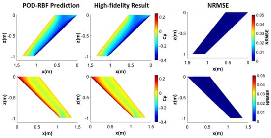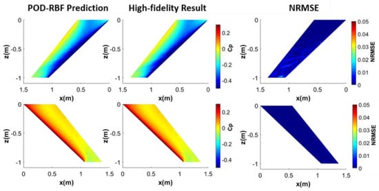 As is the case for the POD-RBF ROM prediction, all NRMSE results are below 4 × 10−3 for both rigid and aeroelastic wings, showing the high accuracy of the RBF-based surrogate model for Cp distribution; however, for the majority of the results predictions for the aeroelastic wing give more accurate results. On the other hand, it is seen that for flow conditions with a very low Mach number, the accuracy of the results for both configurations is very similar. In addition, it is also seen that even though both methods give highly accurate results, accuracy of the prediction of the RBF-based surrogate model is slightly higher than that of the POD-RBF ROM. Since, in the RBF-based surrogate model, the RBF method is applied directly on the snapshot matrix, the slightly higher accuracy of the RBF-based surrogate model compared to the POD-RBF ROM is reasonable.