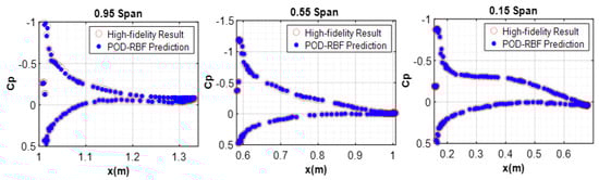 From Figure 16 and Figure 17, one can see that the sectional Cp variations predicted by the POD-RBF method match well with the full order result. For the rigid wing, the R2, RMSE and NRMSE for the POD-RBF prediction of the Cp at the flow condition M = 0.83 and M = 4.75° are calculated as 0.9996, 0.0058 and 0.0026, which shows the great accuracy of the POD-RBF prediction capability for the rigid wing.