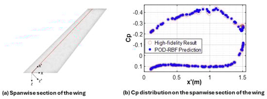 From the NRMSE results given for 10 randomly selected data points and the 11th data point manually added, it is seen that for both rigid and aeroelastic wings a significant accuracy is obtained for the Cp distribution, with NRMSE values less than 4 × 10−3. In accordance with the findings inferred from the reconstruction study, the accuracy of the aeroelastic wing is slightly higher than that of the rigid wing. For the Mach number and the AOA flow condition of M = 0.83 and AOA = 4.75°, corresponding to the highest Mach number and the AOA pair in the intermediate data set, the prediction performance is investigated in more detail for both rigid and aeroelastic wings. In the previous section, it was concluded that 8 modes out of 63 were required to capture 90% of the energy to provide sufficient accuracy in terms of flow reconstruction for the rigid wing. In this section, the POD coefficients corresponding to 8 POD modes are interpolated via the RBF method to obtain the POD coefficients. For this case, the POD coefficient matrix that is used for the regression analysis is 63 × 8. The resultant Cp distributions obtained by high-fidelity CFD analysis and the coupled POD–RBF method for M = 0.83 and AOA = 4.75° are displayed on the 3D rigid wing in Figure 15.