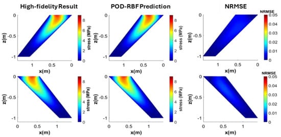 Figure 21 shows the well-matched results of the high-fidelity analysis and the POD-RBF predicted von Mises stress distributions with an R2, RMSE and NRMSE of 0.9997, 0.0384 and 0.0043, respectively. Moreover, the maximum von Mises stresses obtained by the full order aeroelastic analysis is 8.88 MPa, whereas from the coupled POD-RBF approach it is found to be 8.94 MPa.