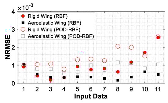 In order to predict the results at intermediate variables that do not exist in the original data ensemble, a surrogate model based on the RBF method can also be used; hence, the model is not reduced and a surrogate model is constructed directly using the original snapshot matrix. Ten random variables introduced in Figure 14 are used as intermediate parameters for prediction purposes. For both rigid and aeroelastic wings, NRMSE values of the Cp distribution for each intermediate variable, obtained using the coupled POD-RBF ROM and the RBF-based surrogate model, are shown in Figure 22.