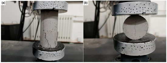As shown in Figure 2, the compressive and tensile strength of the specimen were measured by uniaxial compression and Brazilian tests at a strain rate of 1 × 10−4 s−1. Three compressive and Brazilian tests were performed for each sample (Figure 3). The calculation formula of compressive strength σc is Equation (2).