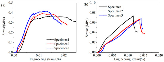 Compressive engineering stress-strain curves of the GB at a strain rate of 1 × 10−4 s−1 at room temperature. (a) Uniaxial compressive; and (b) Brazilian test.