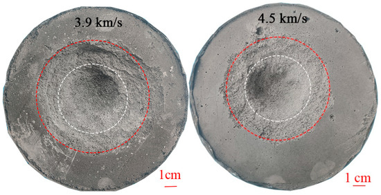 As illustrated in Figure 6, porous GB target cratering results are the same under different velocities. A small central bowl-shaped crater is formed on the target and a large shallow spalling area surrounds the crater. The white dashed circles in Figure 6 are the boundary and transition between the bowl-shaped central crater and the shallow spalling area. For high-pore and low-strength GB materials, crater volume is in part due to the compaction of pore space, and partly due to the excavation of cratering flow. Spallation still dominates the results of craters, and the spalling increases the crater volume. As shown in Figure 7, the cavity is filled with silica gel, and the surface of the cavity is covered with a layer of plastic wrap for demolding after 24 h. As shown in Figure 7, we measured the crater area and the depth of the cavities for quantitative analysis. The is the depth of the deepest point from the pre-impact surface. The average diameter is , . As shown in Figure 8, the depth-to-diameter ratio of porous gypsum–basalt targets was measured to be around 0.5. The speed of test 1 is 2.1 km·s−1, which is lower than the sound speed of basalt 2.4 km·s−1 and belongs to high-speed collision. The velocity of tests 2–5 is greater than the sound velocity of basalt, which belongs to hypervelocity collision. The depth-to-diameter ratio of test 1 is smaller than that of tests 2–5. The depth-to-diameter ratio of impact rock targets is usually around 0.20 [31,37,38]. Compared with the impact chamber homogeneous rock target, the crater depth of the impact porous heterogeneous GB target is deeper, and the diameter is larger. You can find the the experimental parameters and cratering results in Table 2.