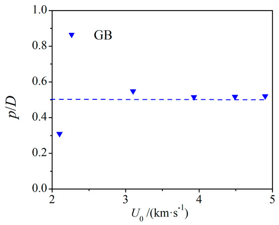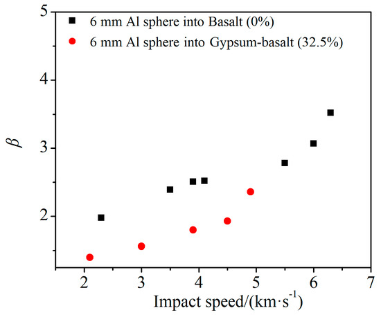 Compared with the impact basalt target, the value of the impact GB target is lower at the same impact velocity. The uniaxial compressive strength of basalt is 145.5 MPa and the porosity is close to 0% [31]. The compressive strength of GB is 0.392 MPa and the porosity is about 32.5%. A large number of experimental and numerical simulation results show that the decreases with the increase in the porosity of the target and increases with the decrease in the strength of the target [27,43]. For porous GB, the inhibition effect of porosity on is greater than the enhancement effect of decreasing target strength. As is shown in Figure 12.