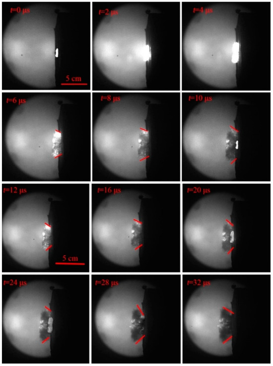 Typical motion evolution progress of the ejecta by 6 mm projectile impacting on GB at 4.5 km·s−1.