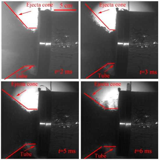As shown in Figure 9 and Figure 10, combined with the image of ejecta motion recorded by the KIRANA 5M ultra-high-speed camera (STFC, Wiltshire, UK) and the i-SPEED 7 high-speed camera, the formation of ejecta is divided into three successive stages. The ejection process and stages are consistent with DART impact ejecta spreading images taken by the Harper Space Telescope (HST) [39] and the Light Italian CubeSat (LICIACube) [40]. First, a high-speed jet is formed. There is fine dust inside the ejecta, which is caused by the vaporization of the projectile or target material caused by the hypervelocity impact. The jet duration is related to the projectile impact speed in theory [41]. The jet lasts for a short time (tens of μs) and is followed by an ejection composed of very fine particles. The fine particle ejecta cone is formed on the target surface with an angle is about 45°. The ejecta cone lasted about 1 ms. As shown in Figure 10, the bottom part of the ejected cone has an increasing inclination angle relative to the target surface and eventually transforms into a round tube. The ejecta is ejected directly backward and perpendicular to the surface of the target at a low speed. The tubular ejecta lasts a relatively long time (hundreds of ms), which can explain the HST image of DART impacting Dimorphos so that the lowest-speed ejecta dispersed through a sustained tail [39].