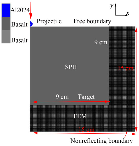 The FEM model of the boulder and regolith part is introduced AUTODYN. The FEM element is transformed into SPH particles (Figure 16), and the SPH particle size is 0.06 m. The small deformation area is modeled by conventional FEM mesh. The FEM mesh size is doubled to 0.12 m. The size of the target is as follows: length 12 m, width 12 m, height 9 m. Basalt was used to simulate boulders in the block area. The regolith is made of porous basalt or pumice. The P-alpha model was used for porous to simulate microscopic pores in the regolith. The projectile is a sphere with a diameter of 0.72 m and a unit radius of 6 particles. Al2024 was used for the projectile. To increase computational efficiency and save computing costs, only one-quarter of the geometries were modeled. The transmitting boundaries are set at the bottom and sides of the target to simulate a semi-infinite target.