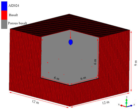 where is yield strength, is the initial yield strength, is the pressure, and is the material coefficient of friction. The coefficient of friction of basalt and pumice is 0.6 [27]. The of basalt, porous basalt, and pumice is 145.5 MPa, 1 MPa, and 1 MPa, respectively. The maximum tensile pressure failure model to simulate tensile failure and the spallation. The A2024, basalt, porous basalt, and pumice failure tensile pressure are 2.5 GPa, 75 MPa, 0.5 MPa, and 0.5 MPa, respectively [55]. The Steinberg–Guinan strength model was used for Al2024. The parameters of the Steinberg–Guinan model are given in Table 5.